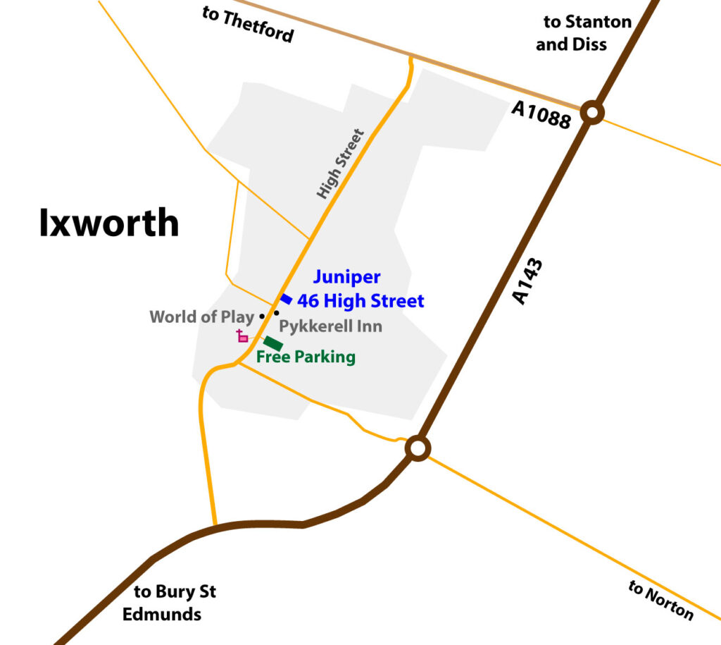 Juniper is on the High Street in the lovely village of Ixworth. The clinic has recently been renovated and I look forward to seeing you there.
