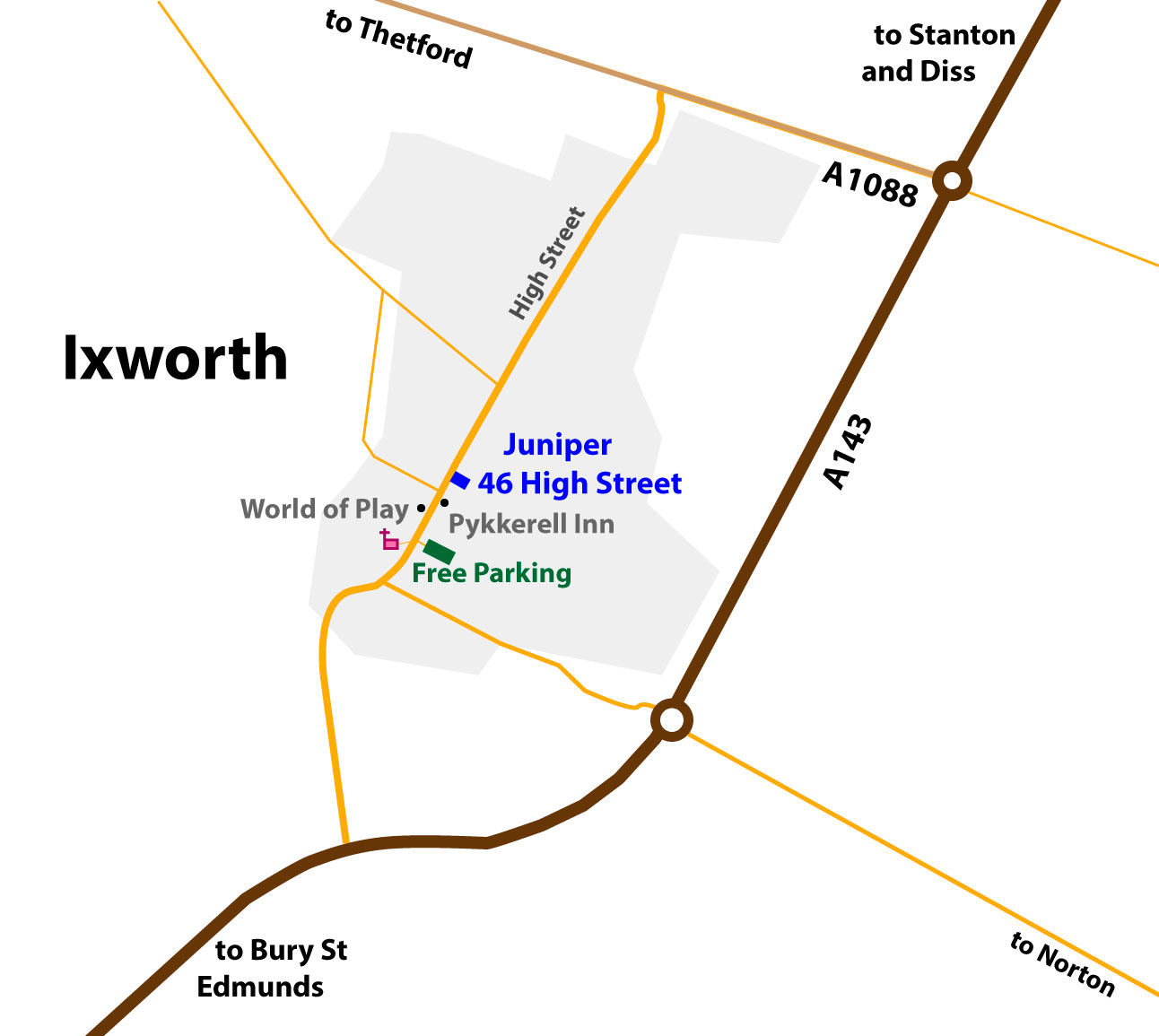 Juniper is on the High Street in the lovely village of Ixworth. The clinic has recently been renovated and I look forward to seeing you there.